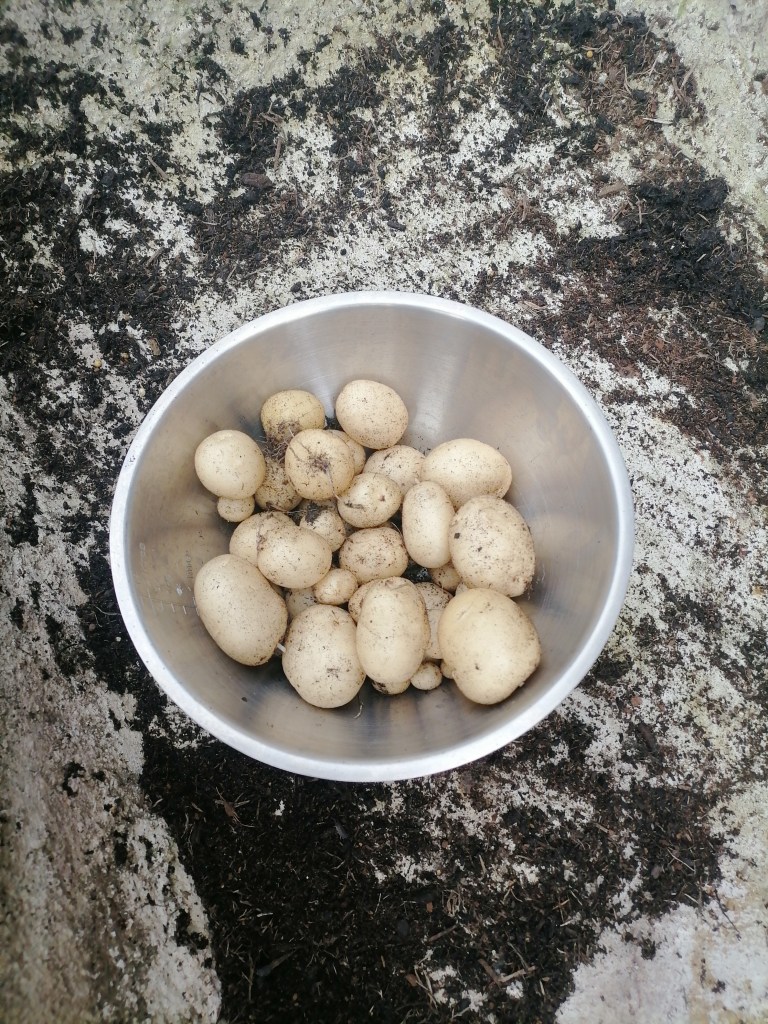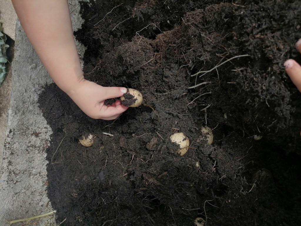 The little ones have been busy recently watering the potatoes, today they harvested the first bag and ate them for lunch, yummy xxx …